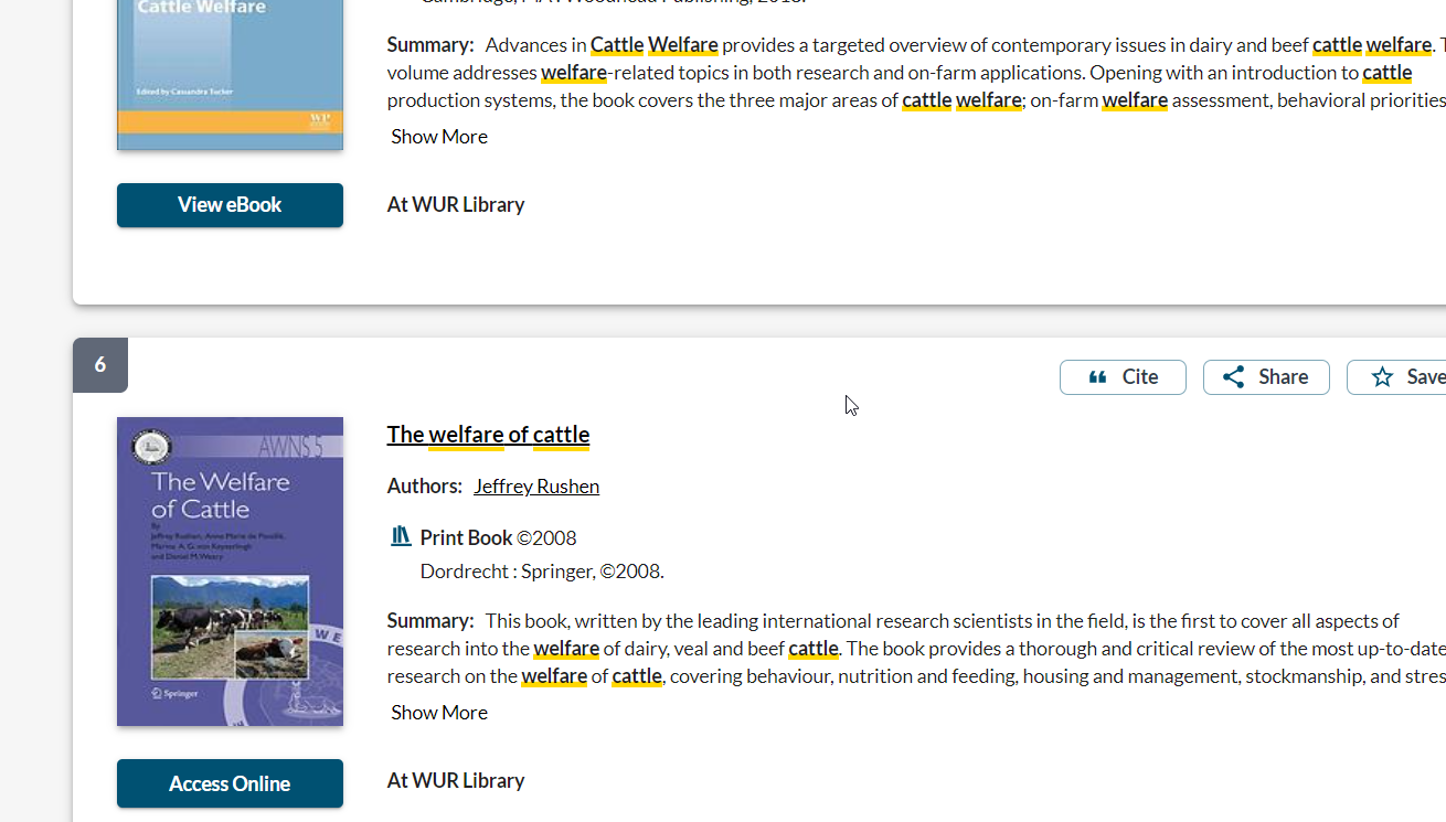 With WUR Library Search you search in a collection of millions of journal articles, books, proceedings and reports. WUR Library Search covers most of WUR Library’s resources, including the Library Catalogue, bibliographic databases and Staff Publications.