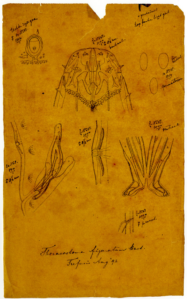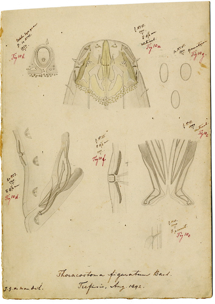 Thoracostoma figuratum, considered T. coronatum nowadays, is a large 8 mm long marine nematode which was found in 1892 near Tréfusis (France) by the Dutch pioneer J.G. de Man; one year later his description was published.