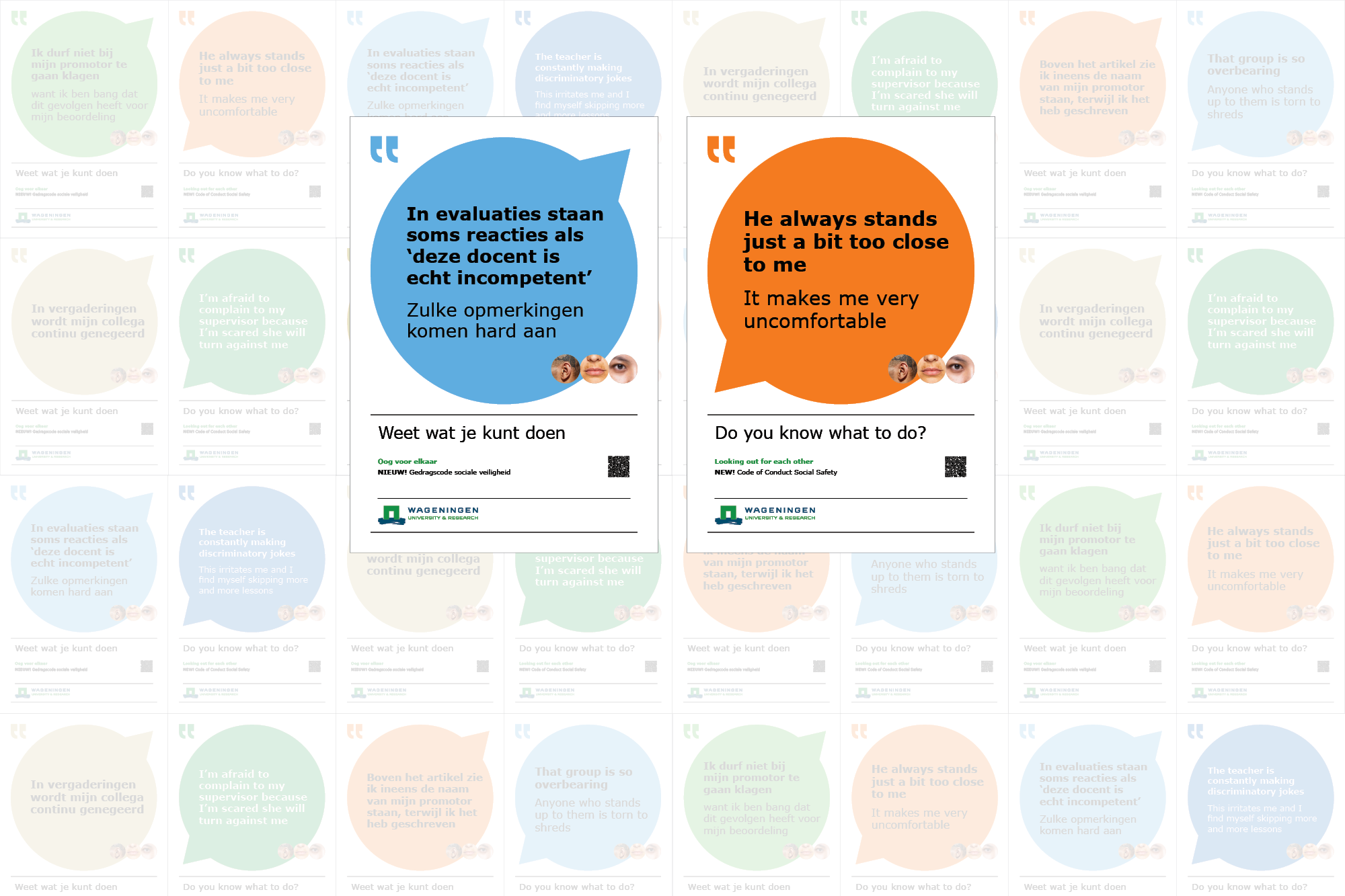 The Social Safety Code of Conduct details what is considered undesired behaviour, what guidelines apply and what to expect from your supervisor and colleagues when you address undesired behaviour. The new code of conduct is based in part on dialogues with students and employees during workshops. A joint definition of undesired behaviour was formulated as follows: ‘Behaviour that is experienced as undesired or offensive and aims to make or results in making a person feel unsafe at their place of work or study.’ WUR has launched a poster campaign with small and big examples of undesired behaviour.