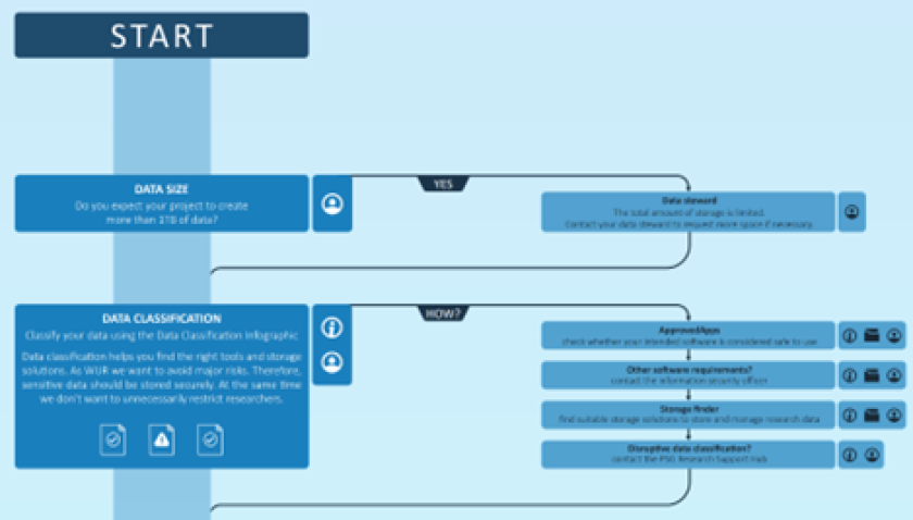 - The original RDM protocol counted more than twenty pages, the researchers also had to read up on 3 intranet pages: one about security, another on privacy and a third one about data management. Most of this information only applies to specific projects, privacy regulation is very strict on human data but says nothing about plants. To simplify the workflow and save the researcher valuable time a flowchart was created. Creating a general flow with questions each project can go through. We could not have done this without the support of the RDM support staff of PSG. Following a flowchart for our business unit, the library is currently trying to simplify the WUR wide procedure.