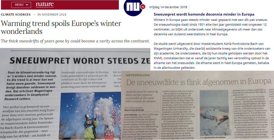 I enjoyed doing my thesis about snow depth and climate change the most. I was always enthusiastic and curious about getting new results and discussing them with my supervisors. Already halfway through the thesis, my supervisors started mentioning that we could try to publish the research, and I got very thrilled about it. I kept working hard, and after receiving a 9 for the thesis, we started adapting the work for publication. In the meantime, the abstract of my thesis was accepted for an oral presentation at an international conference in Budapest. I went to Hungary to present my research in front of around 200 people. It was a great challenge and an unforgettable experience. My thesis was finally accepted in the journal Geophysical Research Letters, a top international journal! To my surprise, a few days later, several (at least 14) national and international media published news about it.