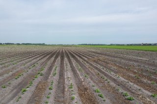 De Festien zetmeelaardappelen in de proef Bodemkwaliteit Veenkoloniën hebben door hevige regenval in de tweede week van mei waterschade opgelopen. Het gewas kwam net boven toen er in zeer korte tijd zo’n 35 mm regen viel en de bodem dit water niet tijdig kon verwerken. Op de laagste plek in het perceel zijn de knollen gaan rotten; de kiemen zijn bruin en de knollen voelen sponsachtig aan (foto Waterschade-II.jpg).