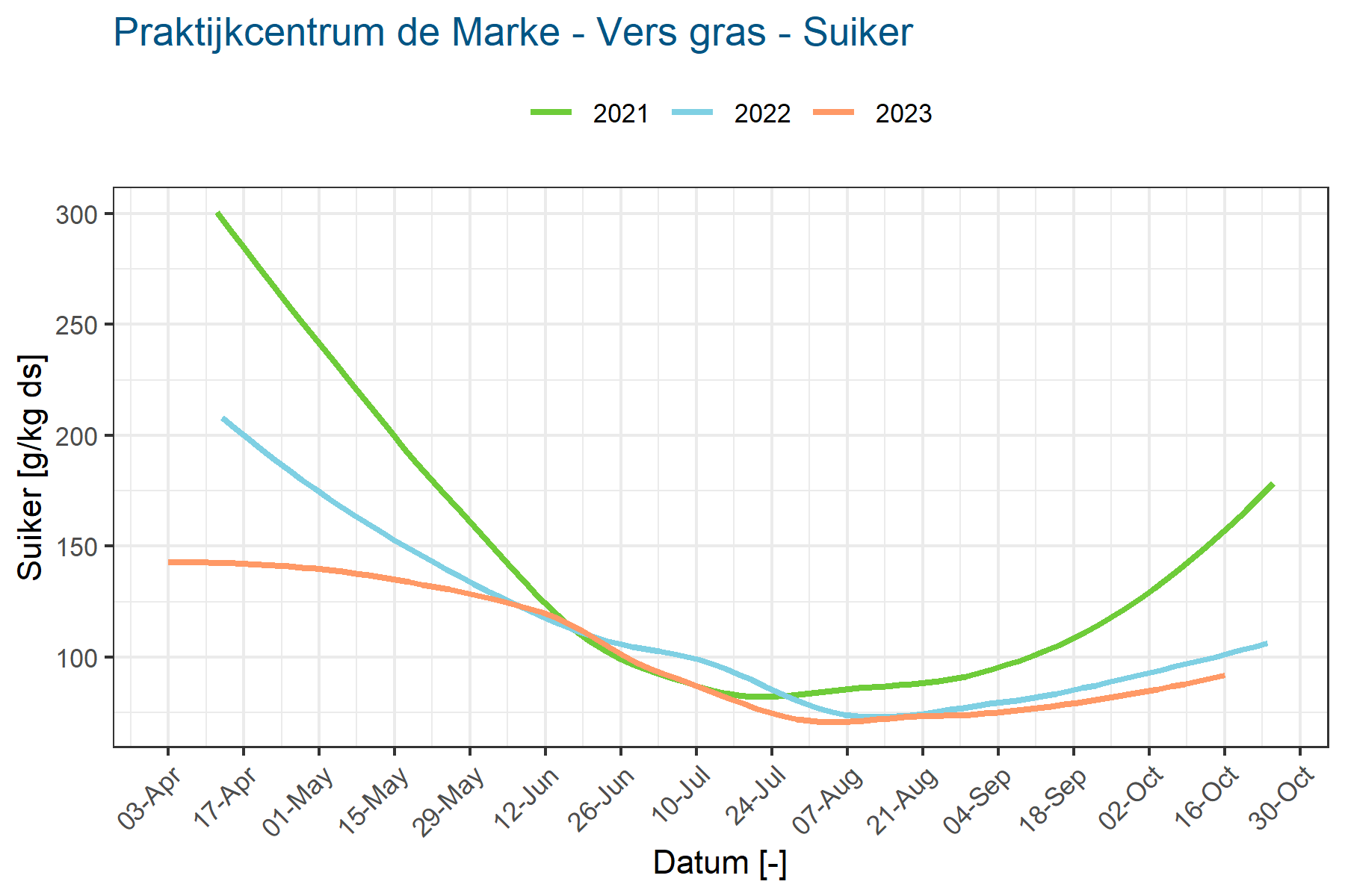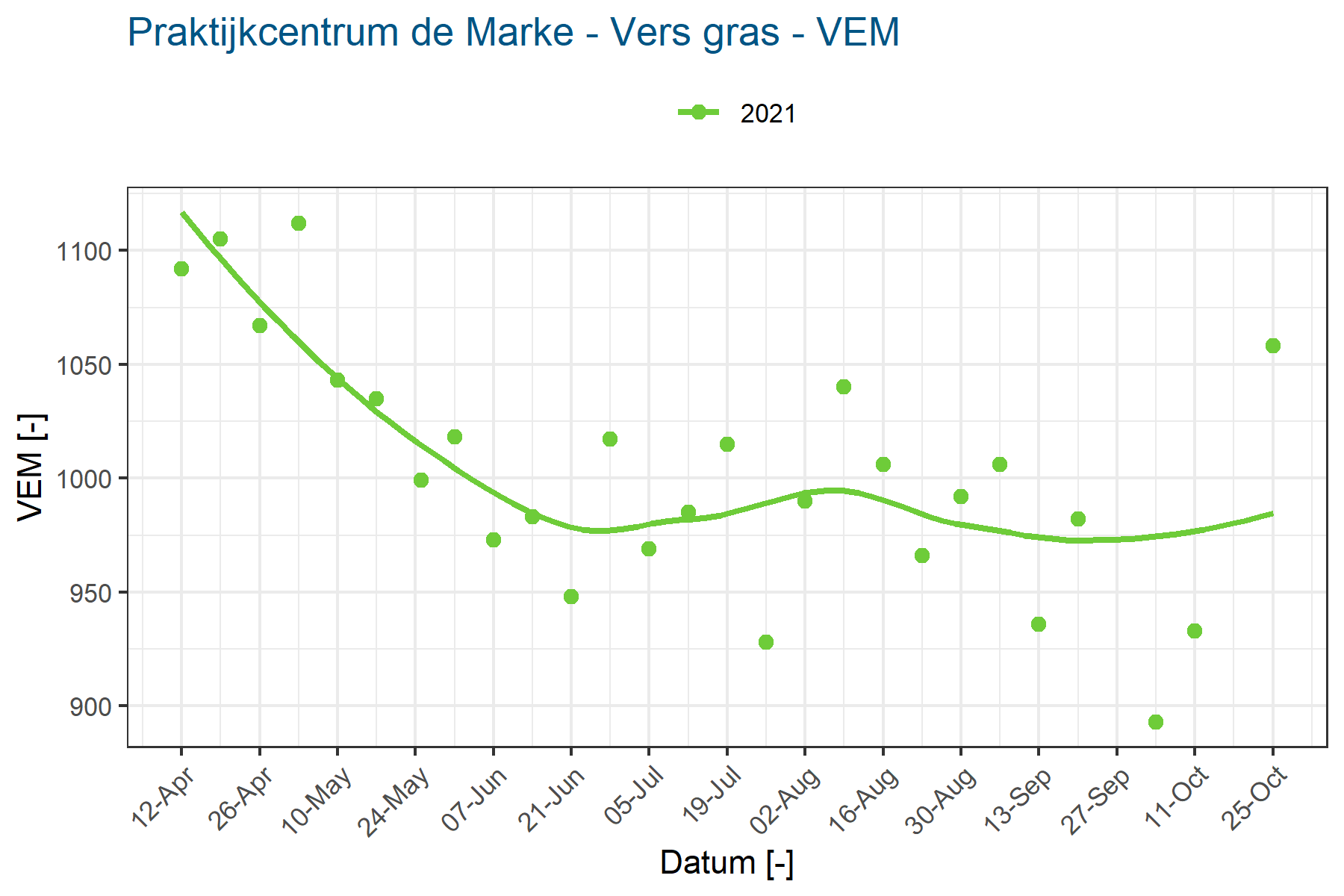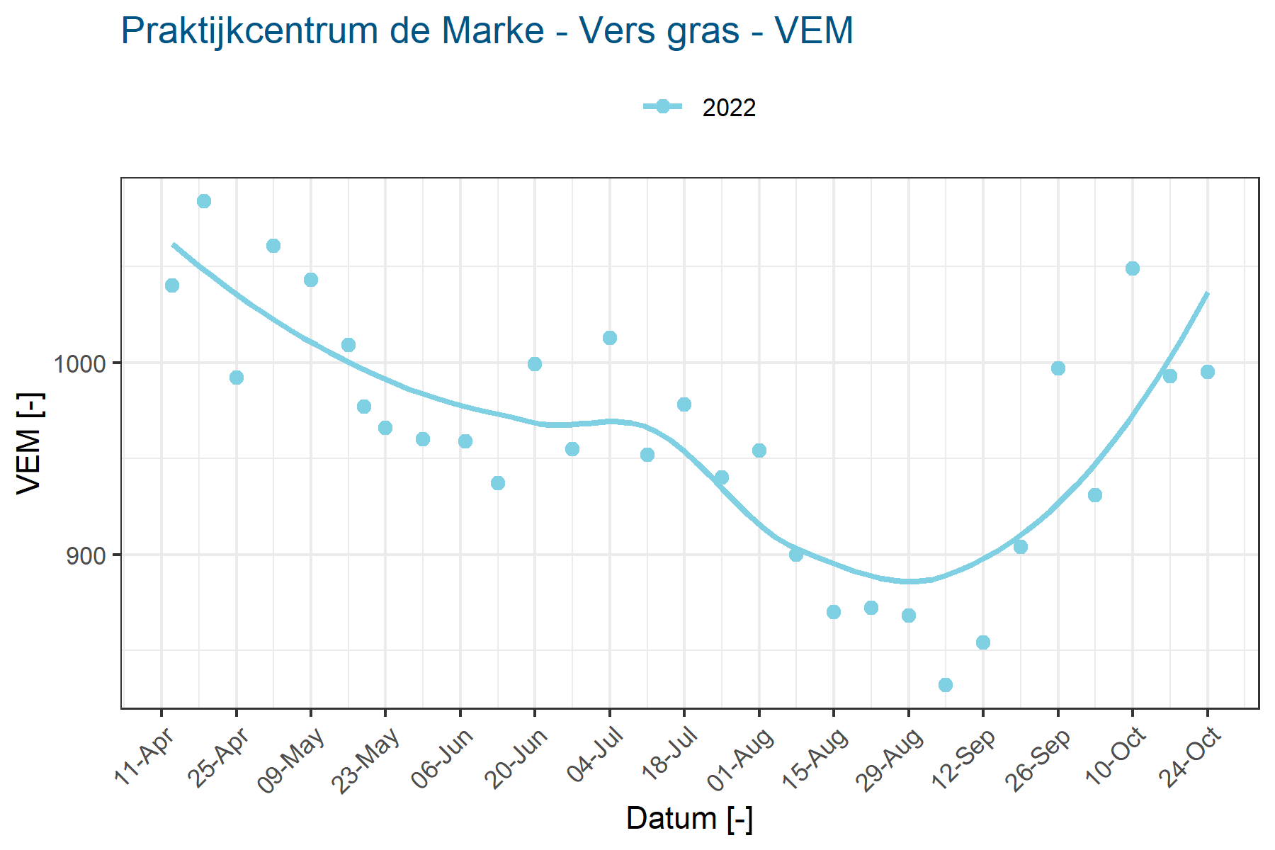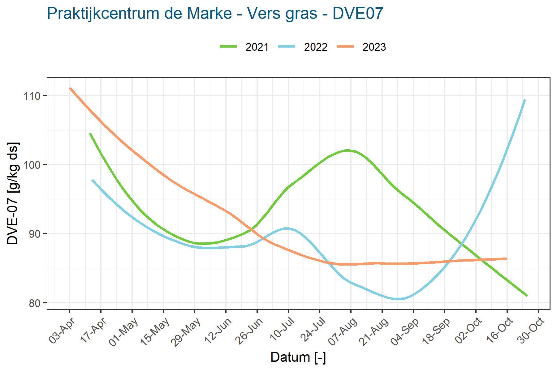De VEM is in hoofdlijnen elk jaar hetzelfde tot de langste dag. Vanaf de langste dag is de VEM elk jaar verschillend. Waar de VEM in 2021 constant rond de 980 bleef tot eind oktober, daalde de VEM in 2022 erg hard tot onder de 900, maar steeg in het najaar weer tot boven de 1.000. In 2023 bleef de VEM onder de 950. Zie de overige afbeeldingen voor de analyse 2021 t/m 2023 van Suiker, Ruw eiwit, NDF en DVE.