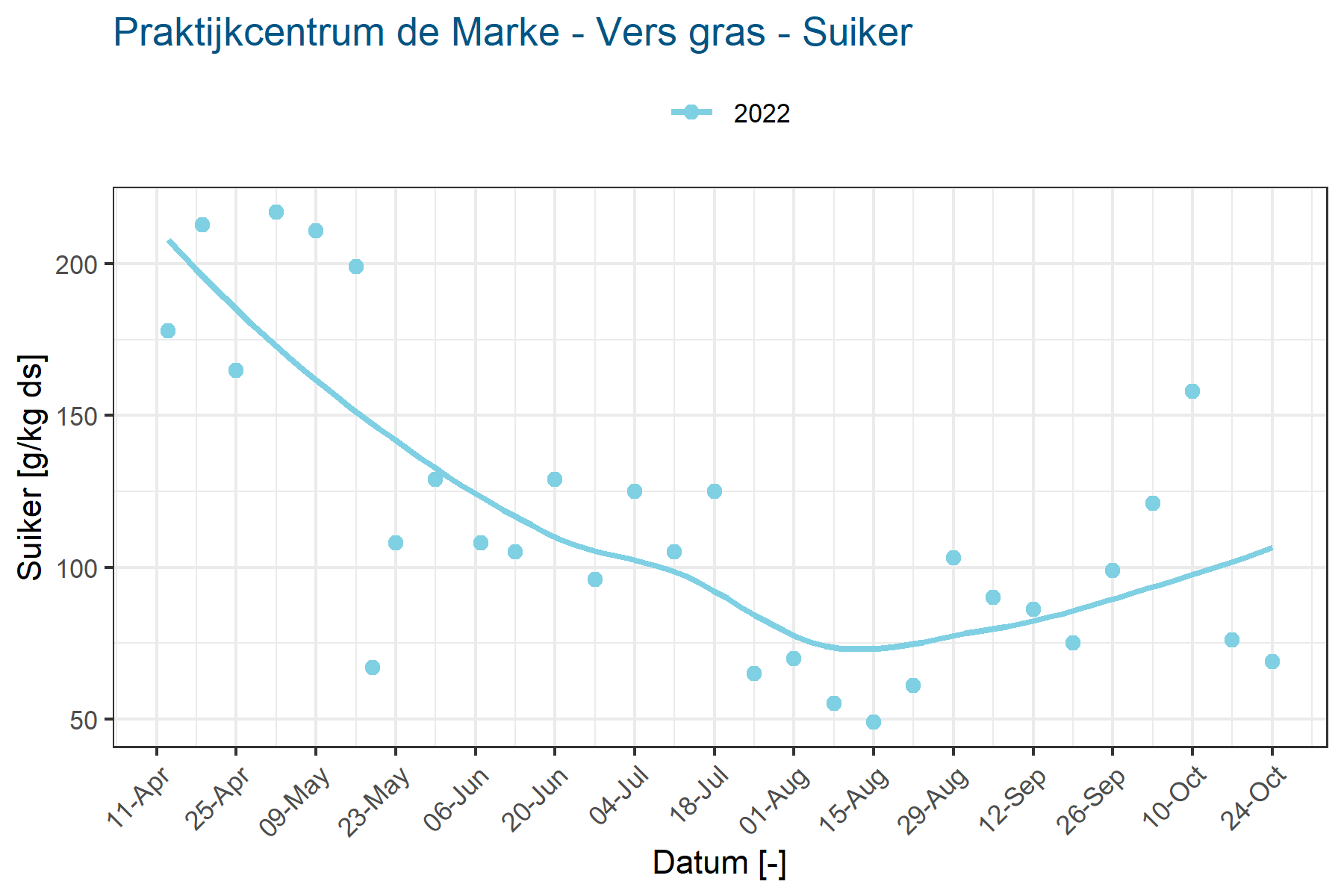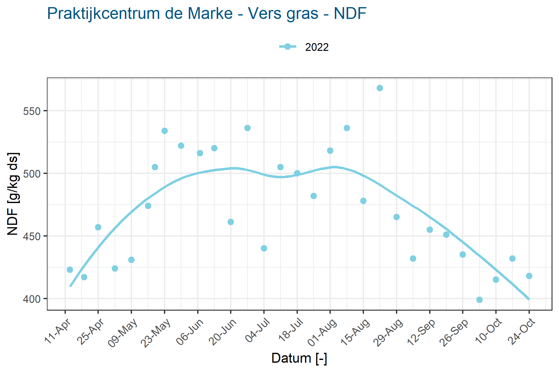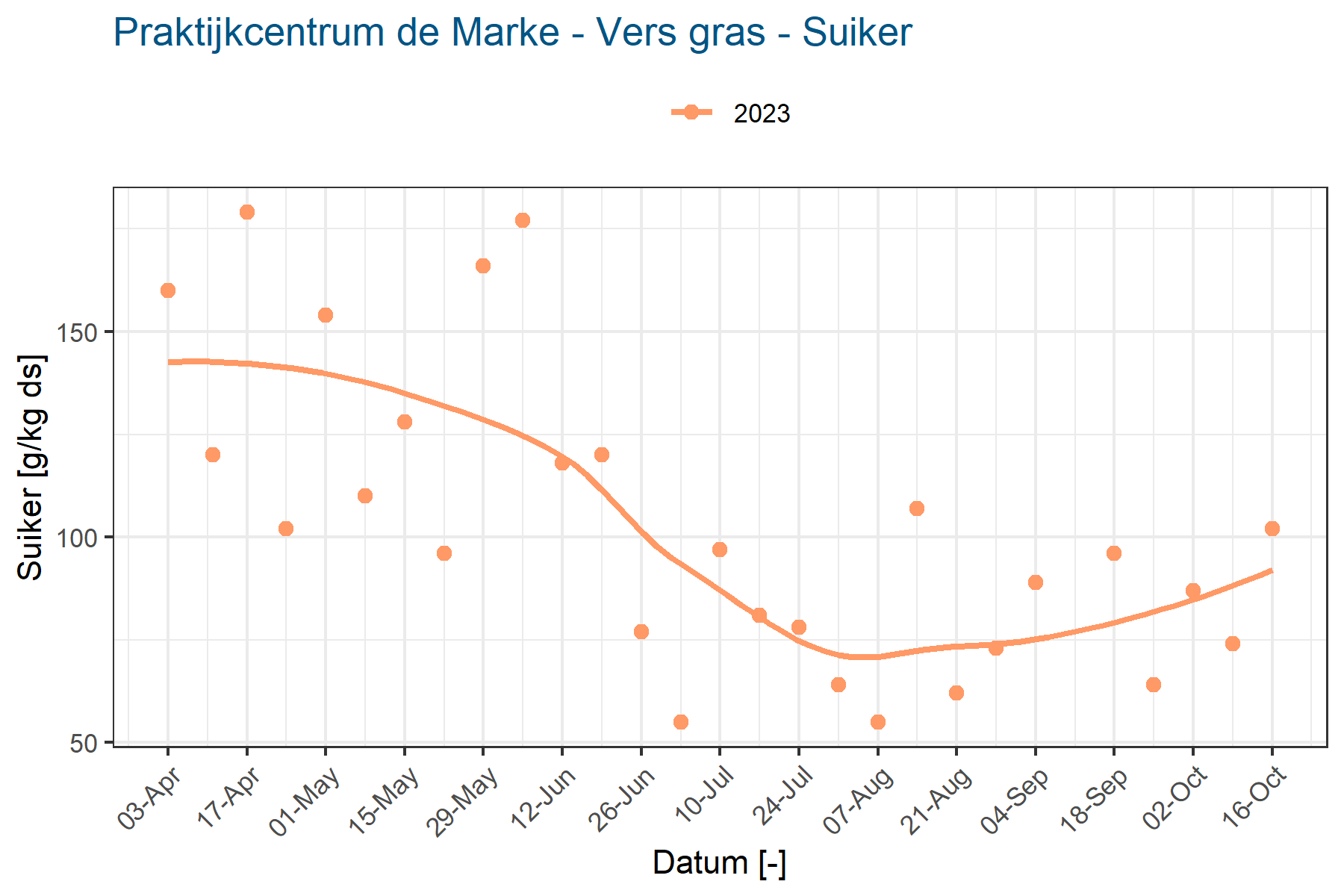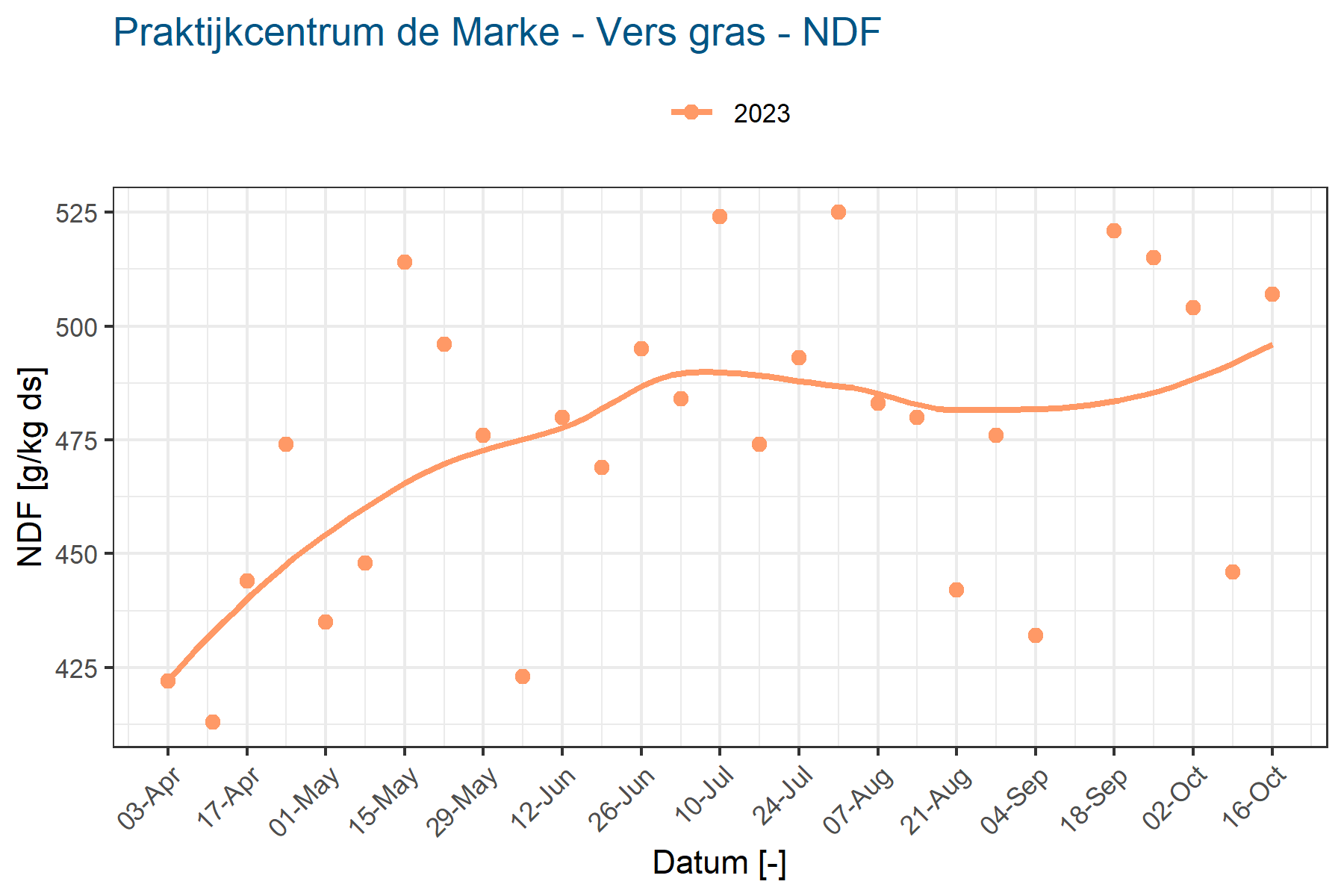 De VEM is in hoofdlijnen elk jaar hetzelfde tot de langste dag. Vanaf de langste dag is de VEM elk jaar verschillend. Waar de VEM in 2021 constant rond de 980 bleef tot eind oktober, daalde de VEM in 2022 erg hard tot onder de 900, maar steeg in het najaar weer tot boven de 1.000. In 2023 bleef de VEM onder de 950. Zie de overige afbeeldingen voor de analyse 2021 t/m 2023 van Suiker, Ruw eiwit, NDF en DVE.