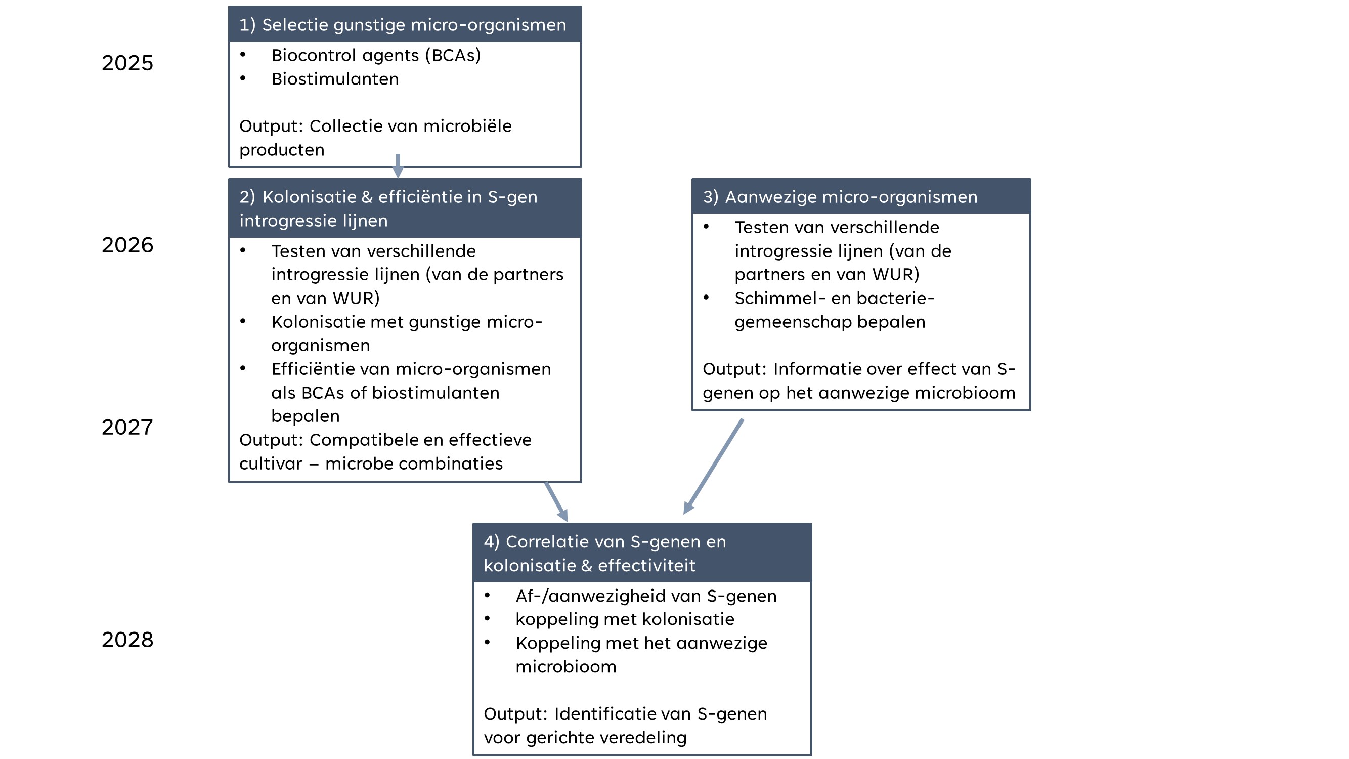 In dit project stellen we voor om het vermogen van geselecteerde gunstige micro-organismen om verschillende introgressie-lijnen van tomaat met aan-/afwezigheid van verschillende S-genen te koloniseren te toetsen. Tegelijkertijd zal de effectiviteit van de gekozen gunstige micro-organismen als biostimulanten en voor ziektereductie worden bepaald. Verder wordt het effect van de afwezigheid S-genen op het natuurlijke plant-microbioom onderzocht. Dit project zal leiden tot de mogelijkheid om gericht te veredelen voor genetische varianten met de mogelijkheid tot samenwerking met gunstige microbiële stammen. Ook zal kennis vergaard worden over de samenwerking tussen planten en micro-organismen, waardoor deze effectiever en doelgerichter kunnen worden gebruikt.